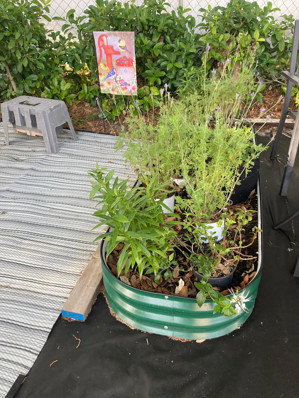 orange metal planter box growing scallions in the backyard